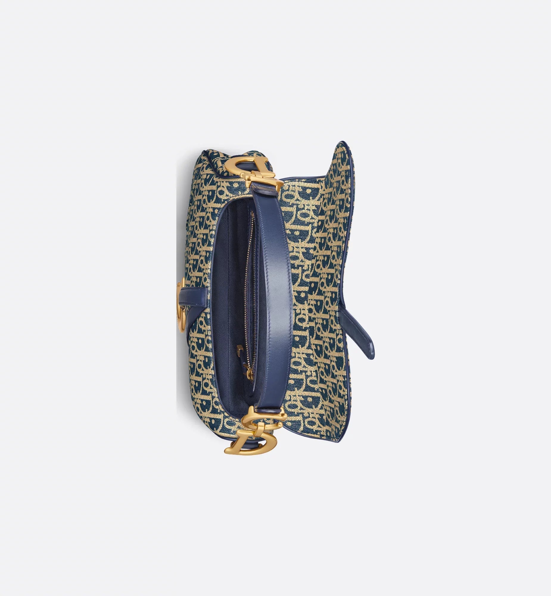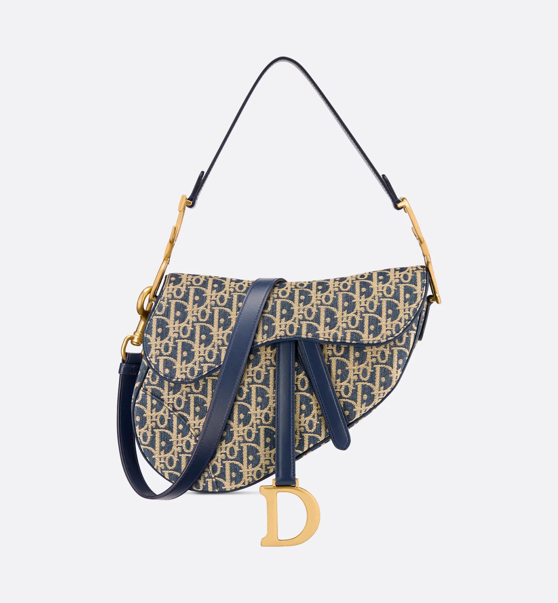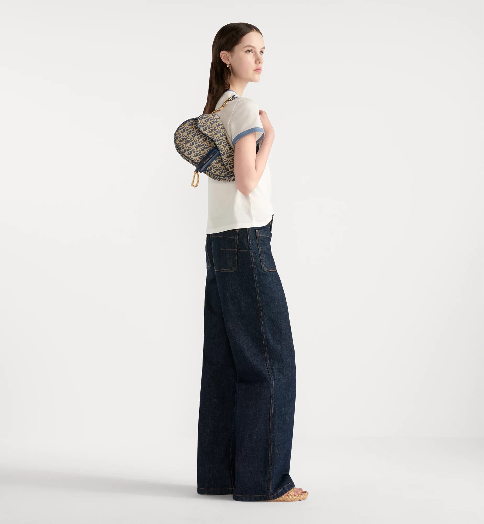 Maria Grazia Chiuri brings a fresh update to the iconic Saddle bag. The legendary design features the refined combination of light biscuit smooth calfskin and blue chambray, a lightweight cotton denim embroidered with ultra-durable raffia thread displaying the iconic Dior Oblique motif. The Saddle flap is enhanced by a D stirrup strap and magnetic pull, as well as an antique gold-finish metal signature on either side of the top handle. Equipped with a thin, adjustable and removable strap, the Saddle bag may be carried by hand, worn over the shoulder or crossbody.