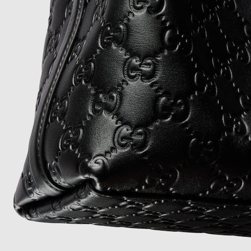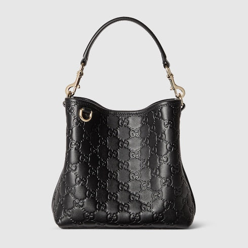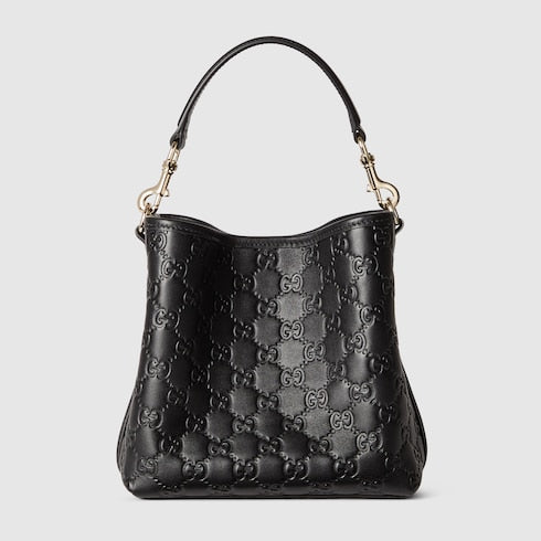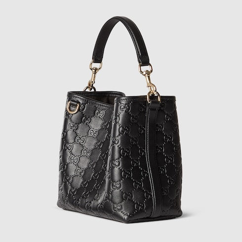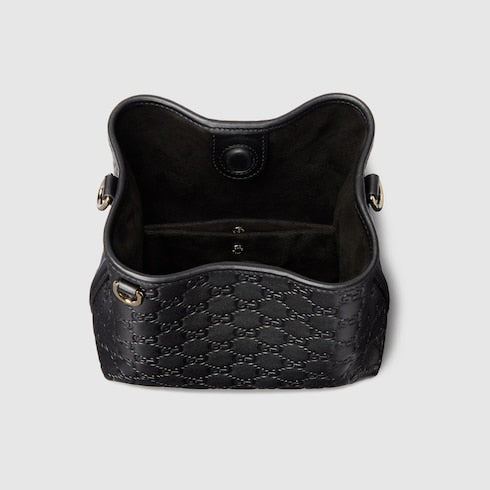 In the Fall Winter 2025 collection, the GG Emblem collection reinterprets the House’s history of elegance and craftsmanship. This bucket bag highlights functional design with an interior compartment, in matching cotton lining.