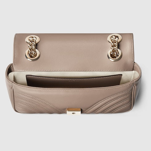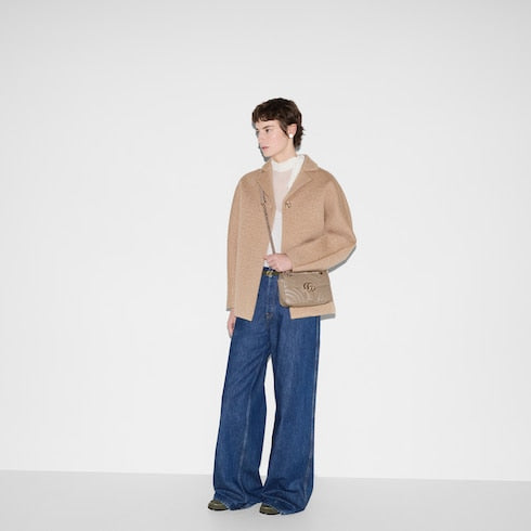 Embellished with the archival Double G logo, first introduced in the 1970s, the GG Marmont bag has established itself as a signature style of the House. The two capital letters of the style’s name refer to this emblem, recognizable by the partially overlapping hardware on the handbag’s front. Crafted from soft matelassé leather, the elegant handbag is evocative of Florentine craftsmanship.