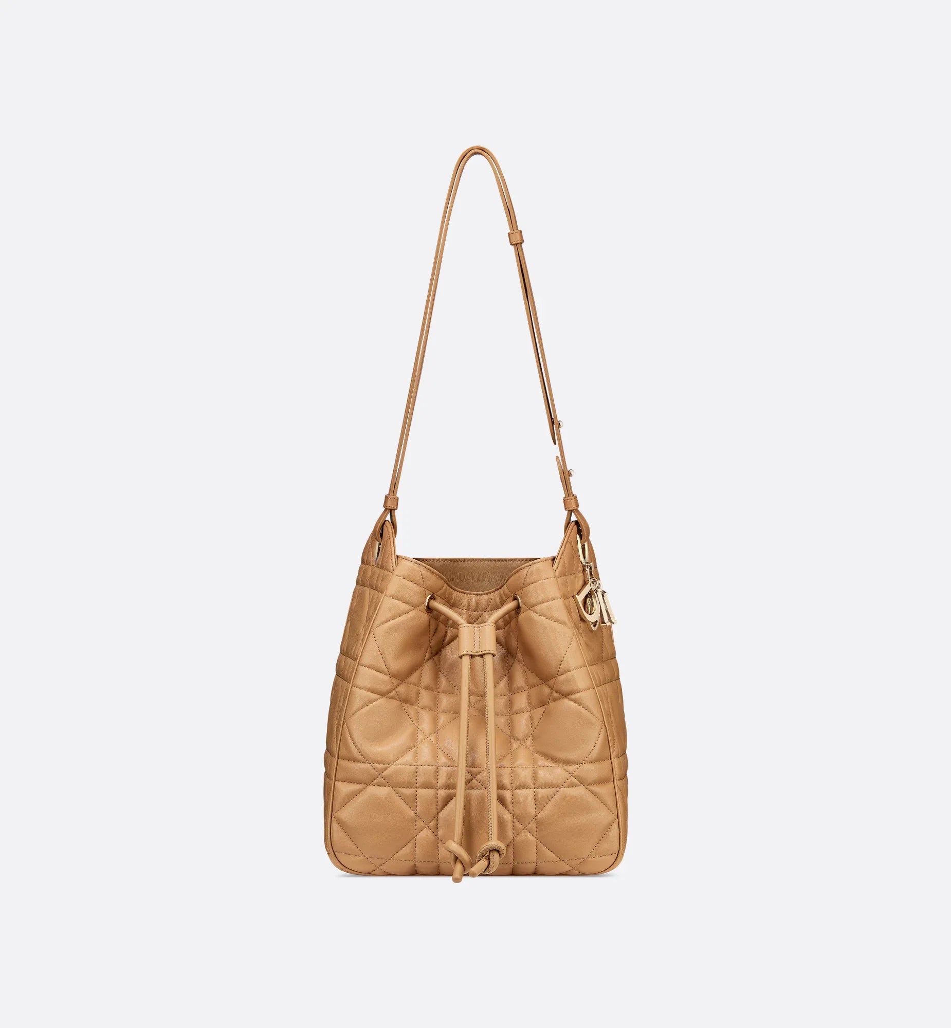 New for Winter 2025, the bag is distinguished by a modern and practical design. Crafted in light gold-tone lambskin with Macrocannage stitching, the supple style features a drawstring closure that opens to reveal a spacious interior compartment with a zip pocket for all the essentials. Adorned with pale gold-finish metal charms, the medium bag has an adjustable strap with a sliding design, allowing it to be worn on the shoulder or crossbody.