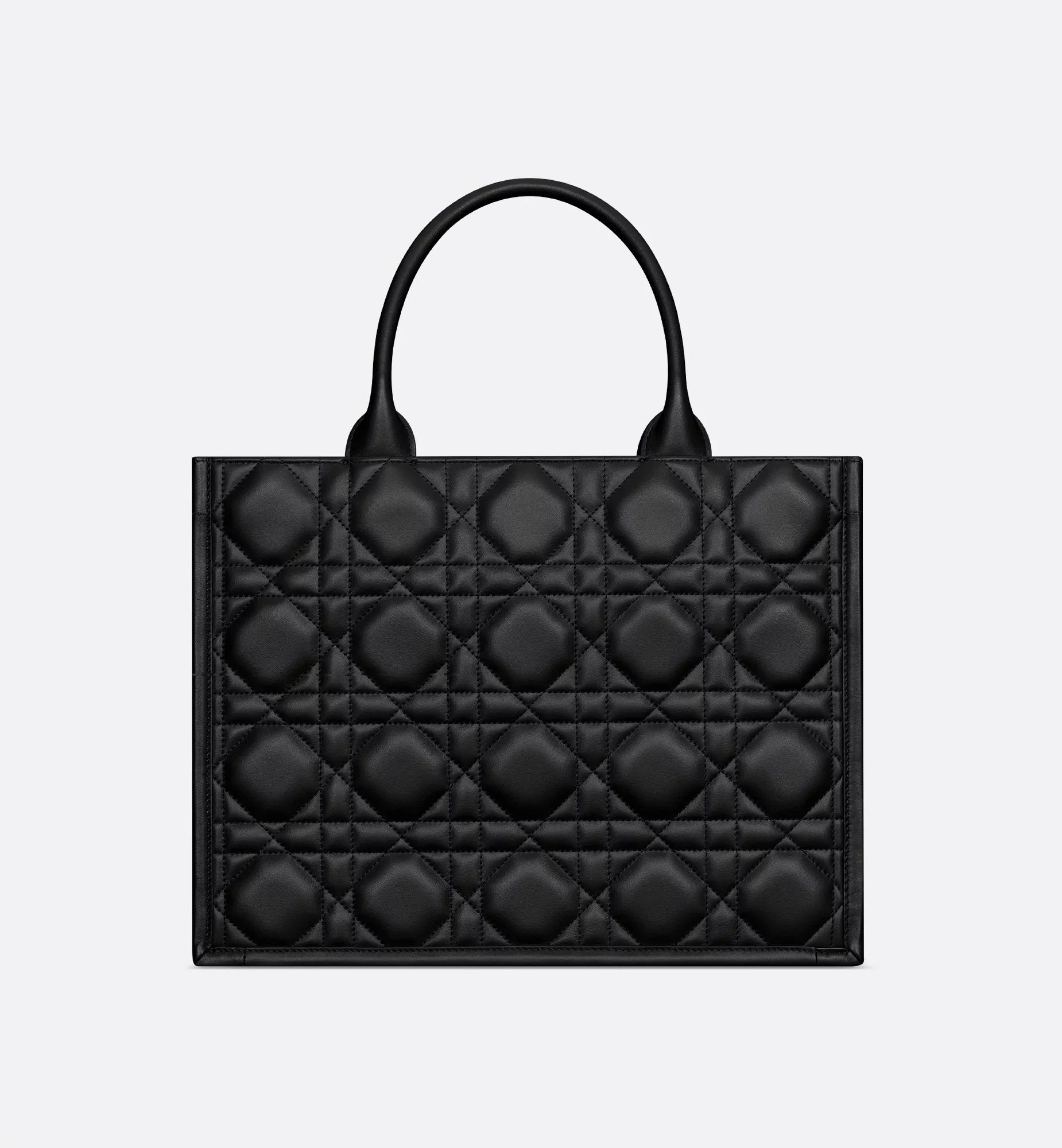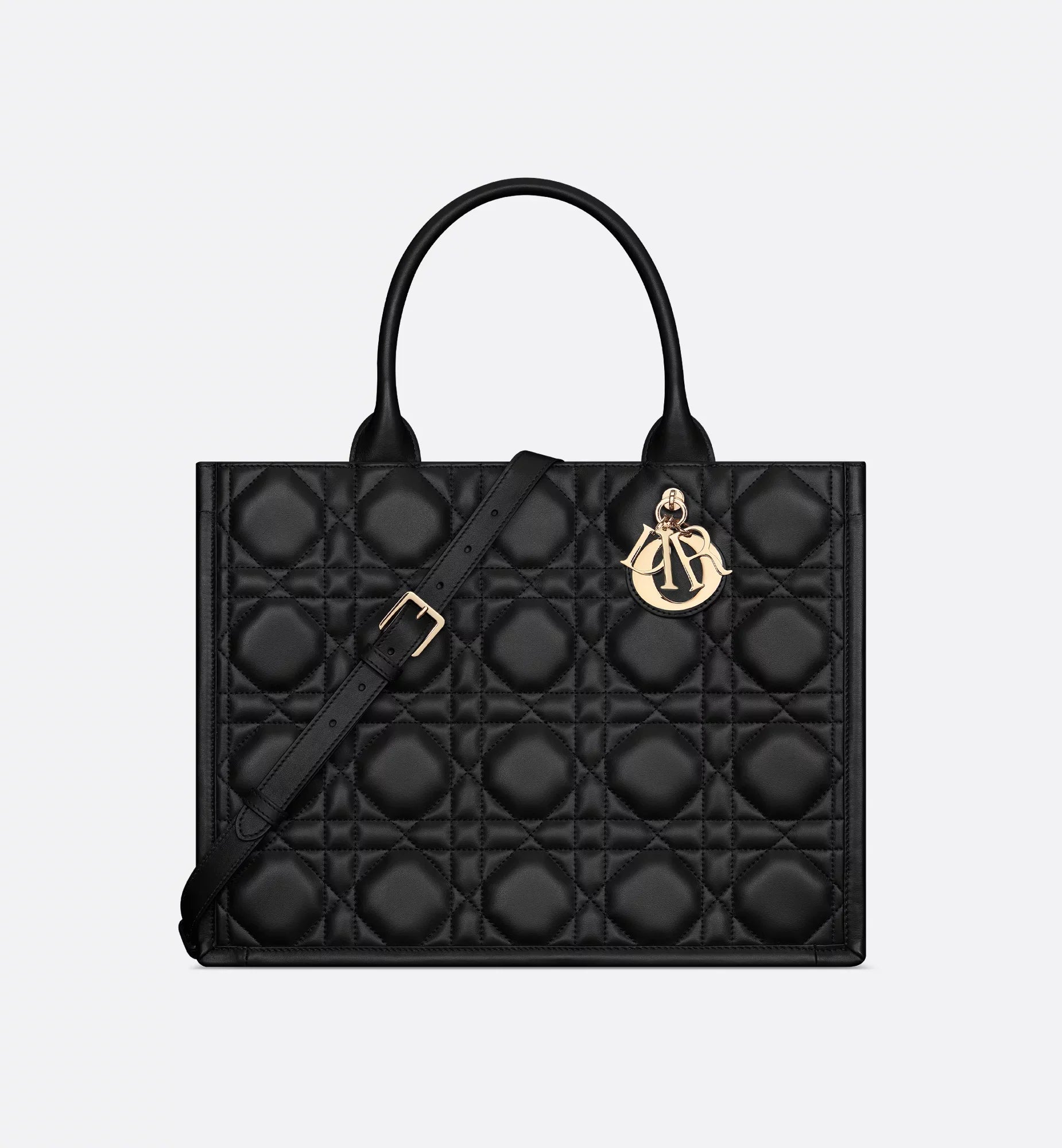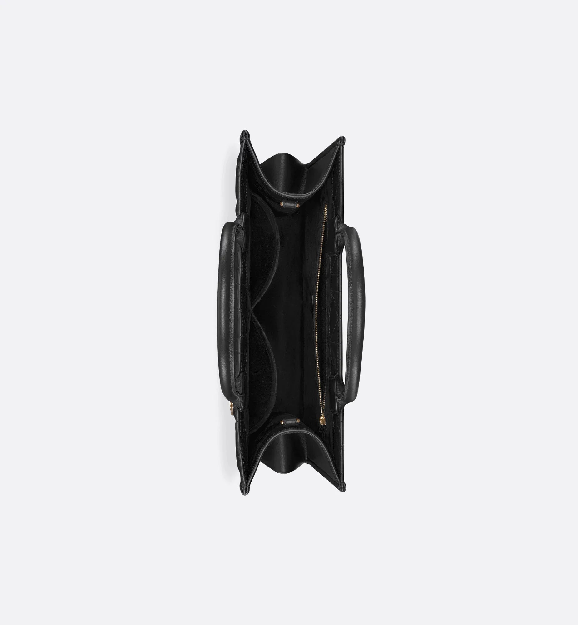 Maria Grazia Chiuri's hallmark Dior Book Tote is available in an elegant new variation. Crafted in black calfskin, the design showcases the Macrocannage motif and is embellished with pale gold-finish metal charms on the front. The cashmere leather interior reveals a zip pocket and slip pockets, ideal for organizing all the daily essentials. Featuring an adjustable and removable strap, the lightweight and practical medium tote is a prime example of Dior savoir-faire and may be carried by hand or worn over the shoulder.