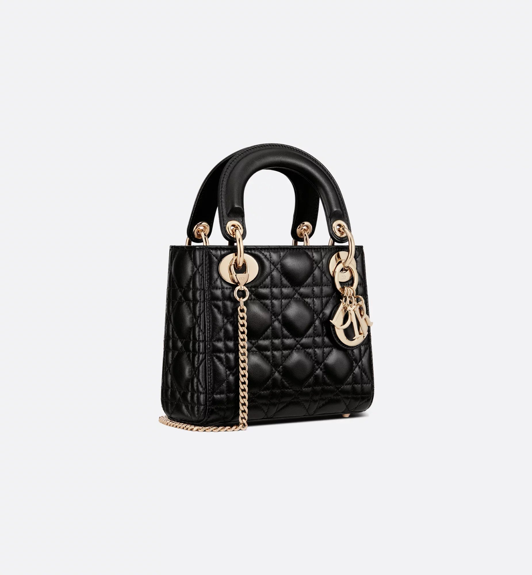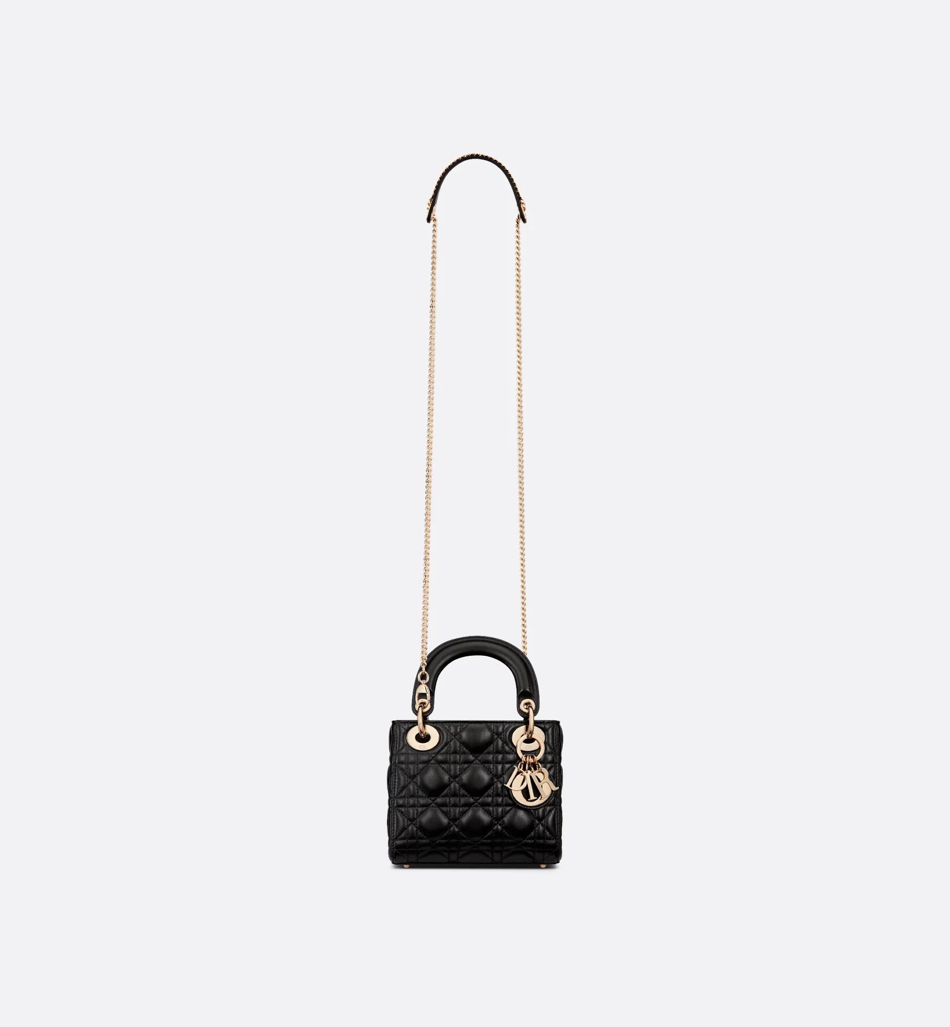 The Lady Dior bag epitomizes the House's vision of elegance and beauty. Sleek and refined, the timeless style is crafted in black lambskin with Cannage stitching, creating the legendary and instantly recognizable quilted texture, while pale gold-finish metal D.I.O.R. charms further embellish its silhouette. Featuring a removable chain shoulder strap, the miniature Lady Dior bag can be carried by hand or worn crossbody as an ideal evening companion.
